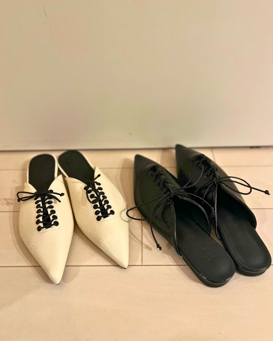 シャープなポインテッドトゥに、繊細なレースアップを掛け合わせたミニマルな一足。